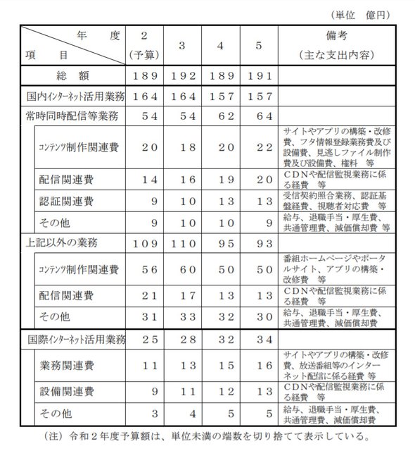 なお、NHKの受信料収入は2019年度で7,115億円だったため、仮にこの2.5%として計算すると、およそ188億円弱をインターネット活用業務の予算に計上することとなる。そして、NHKでは2020年度に総額189億円、2021年度に192億円、2022年度に189億円、2023年度に191億円の費用見込みで計画をしている。