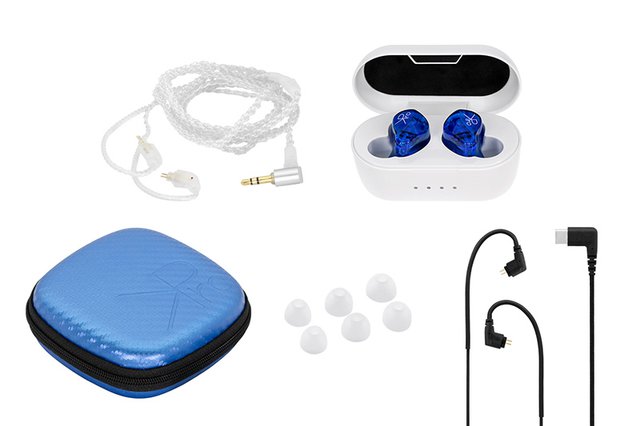 一般販売分はクラウドファンディング時と付属品などの一部仕様が異なっており、イヤホン本体に加えて、有線接続にも対応したUSB Type-C充電ケーブル、シルバーケーブル、充電クレードル、収納ケースをセットにしたパッケージとなる。カラーはブルーとパープルの2色をラインナップしている。