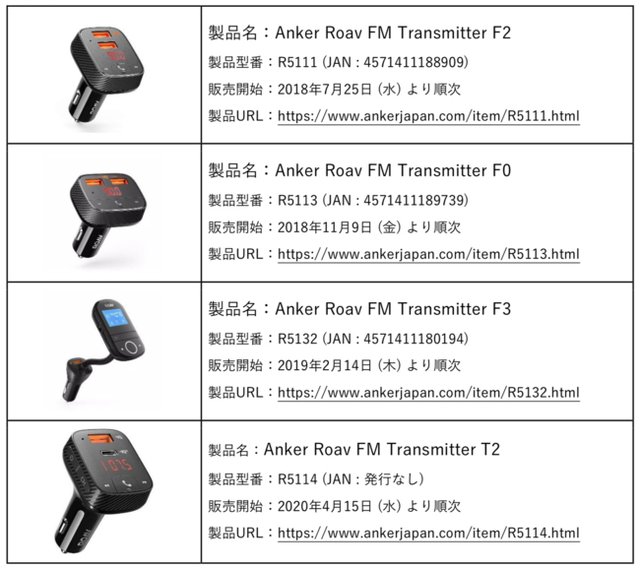 アンカー・ジャパンは、2018年11月より販売を開始した「Anker Roav FM Transmitter F0」、ならびに製品機能が類似する3モデルの自主回収および、返金の手続きを行うと発表した。