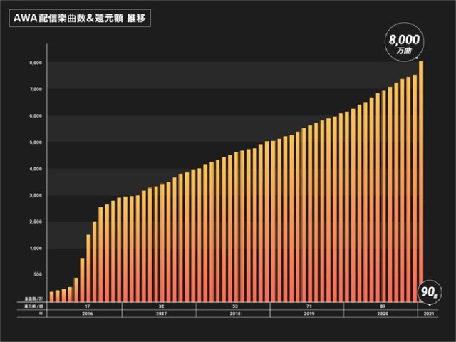 2015年5月にサービスを開始したAWAでは当初、配信楽曲数は167万曲だったが、このたび8,000万曲を突破した。自社調べでは国内初とのこと。合わせて、アーティストに還元した金額は90億円に到達したと発表した。