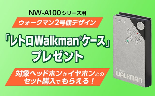 ソニーマーケティングは、ウォークマン「NW-A100」シリーズと対象ヘッドホン・イヤホンのセット購入でNW-A100シリーズ用レトロWalkmanケースをもれなくプレゼントする「W.ired or W.ireless? レトロWalkmanケースプレゼントキャンペーン」を開催。期間は4月12日まで。