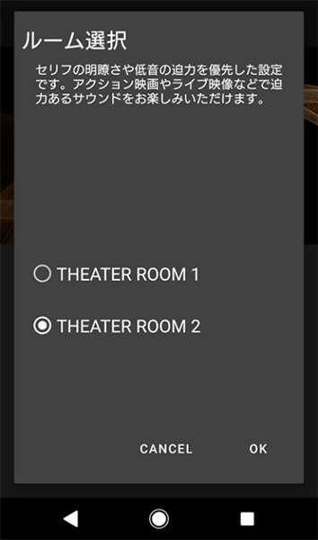 新たに追加した「THEATER ROOM2」では、アプリ内のデータベースから抽出・生成するマルチチャンネルスピーカー(7.1.4ch)の立体音場と定位の各スピーカー特性を再チューニング。低音の出力バランスを最適化するとともに、センターchの余計な響きを抑えることでセリフを明瞭かつ自然に再現するという。