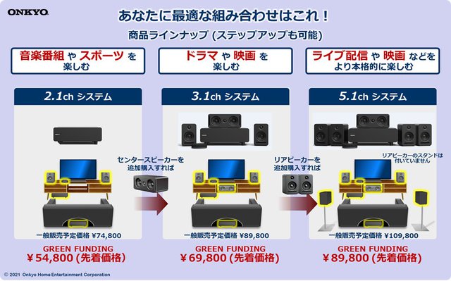 同社では各ラインナップについて、5.1chシステムは自宅でライブ会場のような体験や最新サラウンド音声を収録したゲーム、本格的な映画視聴を楽しみたい場合、3.1chシステムはライブ音源のボーカルを際立たせたい時やドラマなどナレーションの多いソースを中心に楽しむ場合、そして2.1chシステムは音楽系のソースやテレビの音質を簡単に大きく改善したい場合に、それぞれ適していると説明している。