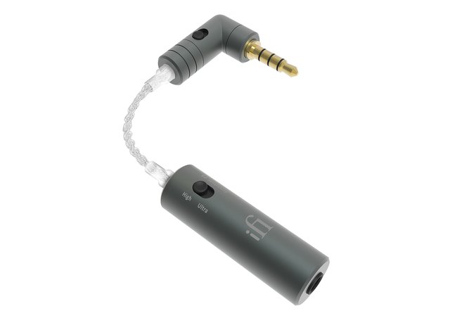 「iEMatch+」は3.5mmTRRSバランス接続と、3.5mmTRSシングルエンド接続の双方に対応。また、Ultra(-24dB)とHigh(-12dB)と2段階のゲイン切り替えスイッチを搭載、アンプの出力レベルやイヤホンの感度に合わせて調整ができる。