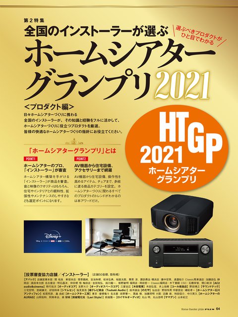 第2特集は「ホームシアターグランプリ2021 プロダクト編」です。こちらはホームシアター施工を手掛けるプロである全国のインストーラーの方に投票いただく、ホームシアター機器のアワードです。選定ジャンルはオーディオ・ビジュアル機器に加えて、住宅設備や調音建材など多岐にわたります。例えば、防音に強い窓は? おすすめの調光機器は? などちょっとマニアックな製品も、本グランプリではカバーしています。アワードの結果が知りたい方は必読です。