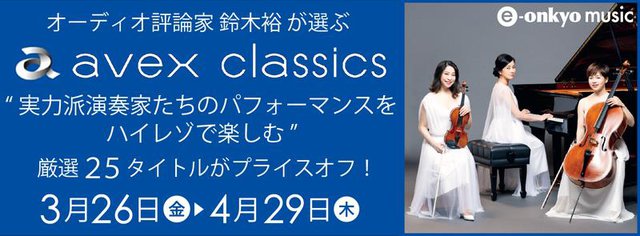 オーディオ各誌で健筆を振るう鈴木氏が、e-onkyo musicの特集企画にてavex classicsの音源から「オーディオ的視点」でセレクトしたという、オーディオファイル必聴のアルバム25タイトルが対象。「編成の大きさ」と「音の傾向」という観点から5つのカテゴリに分け、特に日本の若手演奏家の作品を中心にセレクトしたとのこと。