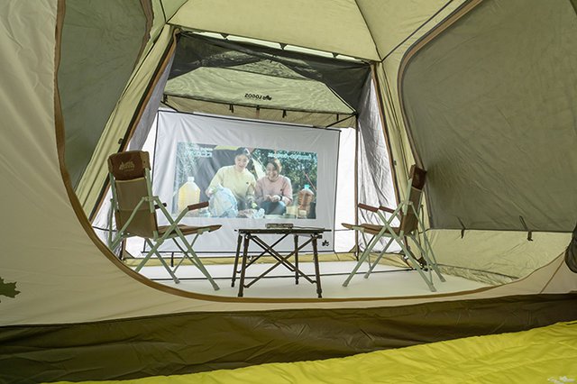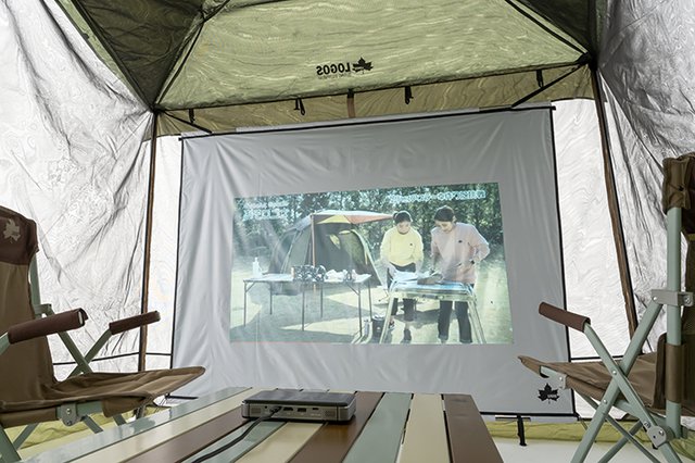庭やテント内、オフィスなどの室内でも利用可能。視聴には別途市販のプロジェクターが必要となる。別売のペグでスクリーン下部のゴムリングを固定することで、風の影響を防ぐことができる。また、別売りの3ルームテントへの取り付けも可能となっている。