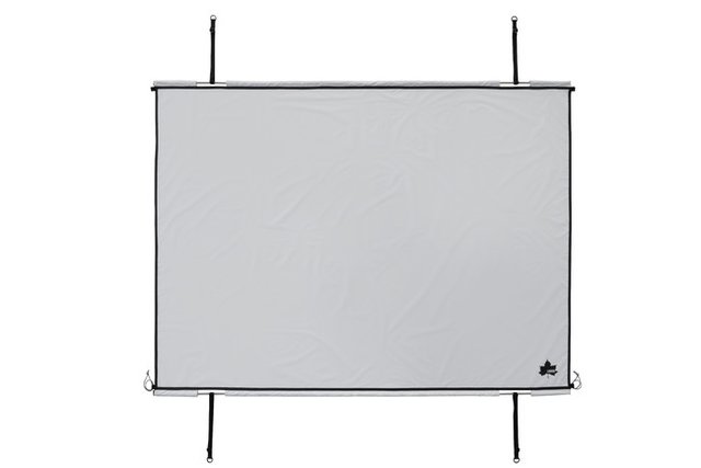 付属の連結ロープをテントやポールに結んで使用するためネジ等は不要で、屋外でも手軽に大画面を実現できる。スクリーンのサイズは200W×150Hcm、質量は約970g。