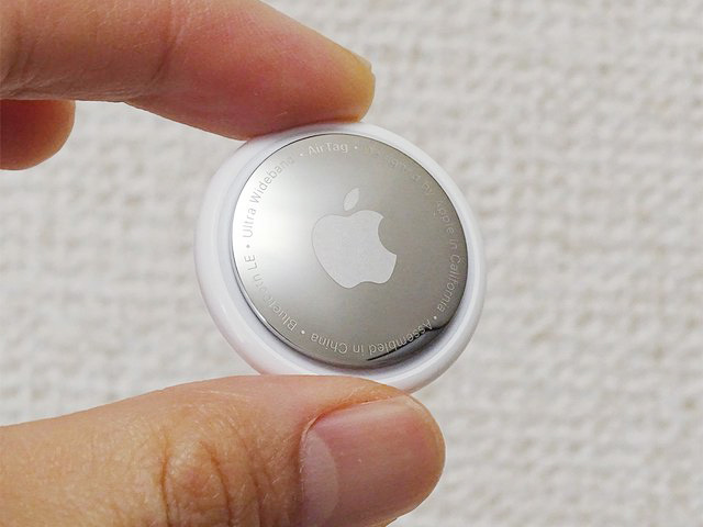 AirTagも実機の画像をご紹介しよう。サイズは500円玉よりもひとまわり大きいが、質量が11gととても軽い。ステンレススチールの本体側にアップルのロゴが刻まれている。