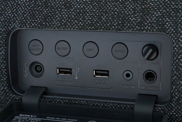 SRS-XG500は、約25mm径のドームトゥイーター2基/約110mm×110mmの矩形ウーファー2基、低域を増強するパッシブラジエーター2基を搭載。IP66の防水/防塵も備える。