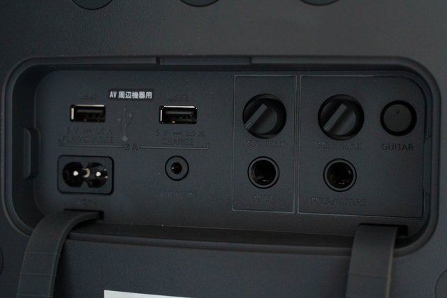入力端子はステレオミニ1基/マイク1基/マイク・ギター1基/USBポート2基を搭載。BluetoothコーデックはLDAC/AAC/SBCをサポート。連続再生時間は最長約20時間(MEGA BASSモードオン時)、外形寸法は275W×572H×295Dmm、質量は約11.2kg。