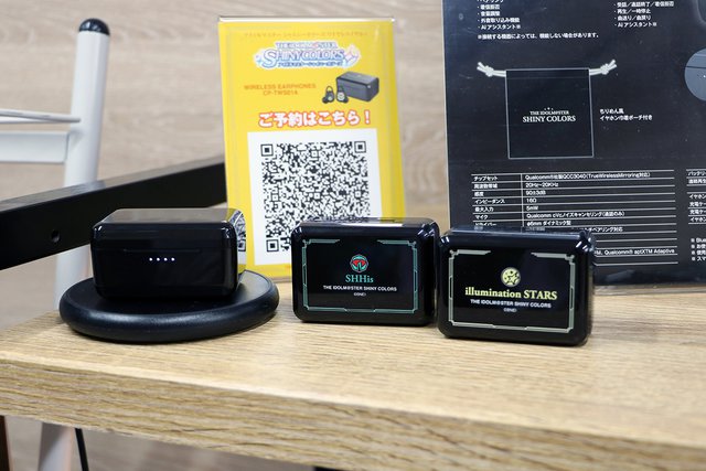 入口のすぐ左手は最新のコラボ製品を展示するスペースとなっており、取材時には4月5日より予約受付開始された『アイドルマスター シャイニーカラーズ』コラボ完全ワイヤレスイヤホンを展示。棚には試聴用のベースモデルと全コラボラインナップの見本品が置かれており、使い心地を試しながらデザインを確認できるようになっていた。