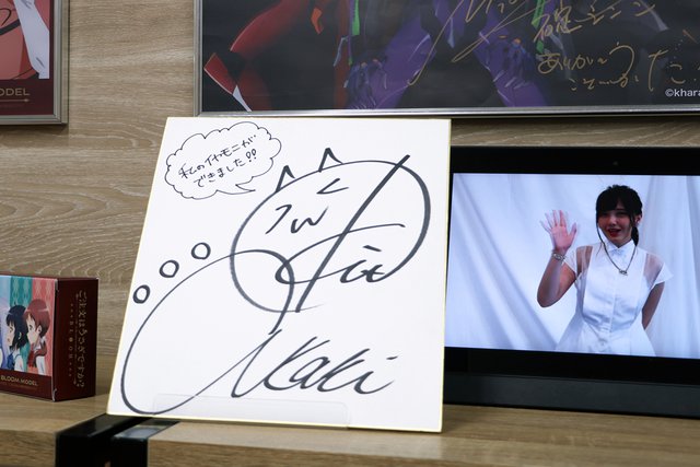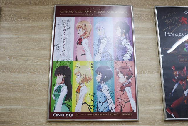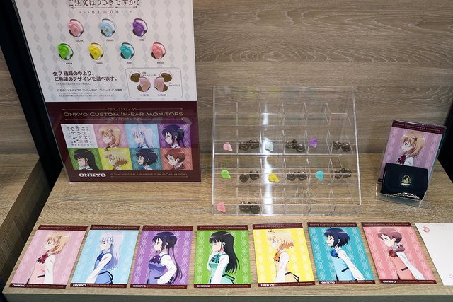 店の中ほどには、棚3個分にわたるコラボカスタムIEMコーナーを用意。現時点でオーダー可能な「鬼頭明里コラボモデル」「ガールズ&パンツァーコラボモデル」「ご注文はうさぎですか? コラボモデル」「エヴァンゲリオンコラボモデル」の全デザインパターンやオリジナルパッケージ、ポストカード、ケースなどの実物が確認できるようになっており、またサイン入り色紙やポスターの展示も実施。