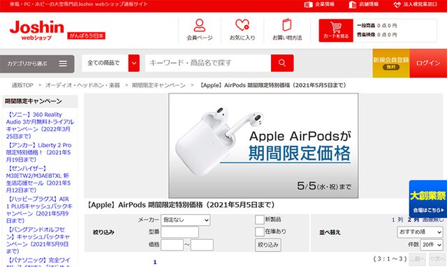 既報の通り、アップルの完全ワイヤレスイヤホン「AirPods」シリーズが各種ECサイトで値下げされている。ただし、この値下げは5月5日までの期間限定であることを案内しているECサイトもある。