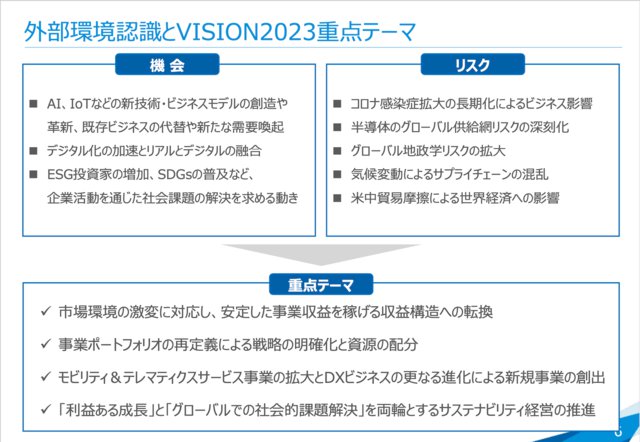重点テーマは、安定した事業収益を稼げる収益構造への転換、事業ポートフォリオの再定義による戦略の明確化と資源の配分、モビリティ&テレマティクスサービス事業の拡大とDXビジネスの更なる進化による新規事業の創出。それらのベースになるのは、「利益ある成長」と「グローバルでの社会的課題解決」を両輪とするサステナビリティ経営の推進とする。