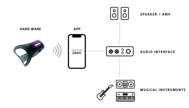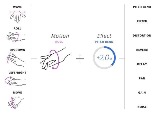 エフェクトはピッチベンド/ディストーション/ディレイなど8種類が用意されており、これを手首を回す/手を上げ下げする/横に振るなどのモーションと組み合わせることが可能。設定などは専用のiOSアプリから行い、楽器と接続したオーディオインターフェイスにアプリを起動したスマホをUSB接続することで、出力信号にエフェクトをかけることができる。