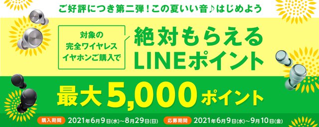 2月〜5月にかけて実施された「はじめよう!いい音キャンペーン」に続く第2弾。 期間中にテクニクス・パナソニックの完全ワイヤレスイヤホン対象商品を購入の上、 キャンペーン応募サイトから応募した方全員にLINEポイントをプレゼントする。