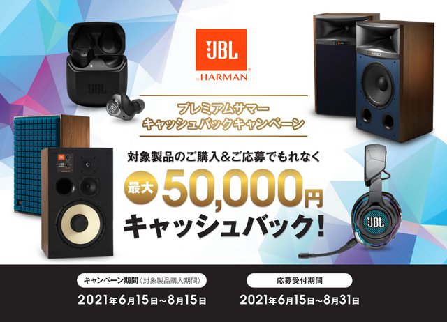 ハーマンインターナショナルは、同社取り扱いブランドのJBLが今年創立75周年を迎えることを記念して、ヘッドホン/イヤホン・スピーカー購入者を対象にした「JBLプレミアムサマーキャッシュバックキャンペーン」を、2021年6月15日〜8月15日まで実施する。