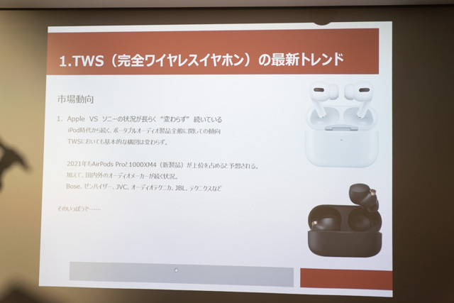 まず野村氏は、完全ワイヤレスイヤホンの市場動向について解説。まず強調したのが、かつてウォークマンの対抗馬としてiPodが登場して以降、ソニー対アップルの戦いが、完全ワイヤレスイヤホンでも起こっているということだ。