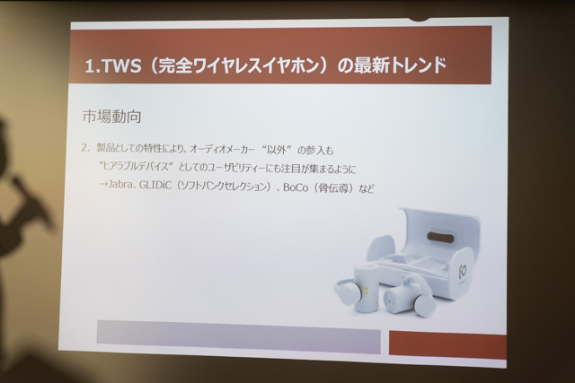 そして、完全ワイヤレスイヤホンにはオーディオ以外のメーカーも参入している、と野村氏。例として挙げられたのは、JabraやGLIDiC、BOCOといったブランドだ。これらのメーカーは、「ヒアラブルデバイスとしての使い勝手のよさや利用頻度の高さ、長時間使っても苦にならない製品」をラインナップしており、「なかなか面白い状況になっている」という。