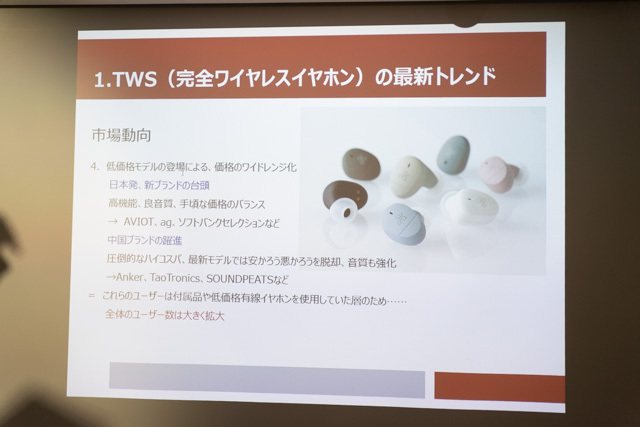 特にハイコスパ製品については、日本のAVIOT、ag、GLIDiCなどのブランドが、高機能/良音質/手頃な価格のバランスを備えているとのこと。また圧倒的な低価格で中国ブランドも躍進しており、AnkerやSOUNDPEATSなど、2年前と比べて音質も良くなるなど、有力な存在になったという。