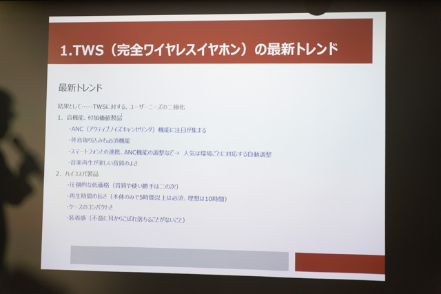 なお、ハイコスパ製品であっても、近年は「安かろう悪かろう」では売れず、最低限必要なスペックがあるとも紹介。たとえばバッテリー持続時間については、上位モデルでは10時間超え、安い製品でも5時間が最低ラインで、安くても3時間程度では厳しいという。そして、装着感についても、これからのテーマになると解説した。