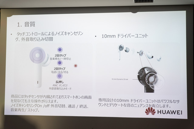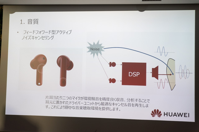 あわせて、FreeBudsシリーズの最上位モデル「FreeBuds Pro」についても言及。「イヤホンでここまで必要ないんじゃないかな、というくらいの、ガチガチのノイキャンを搭載している。簡単かつ手軽に高性能を使いこなせる製品だ」と述べた。
