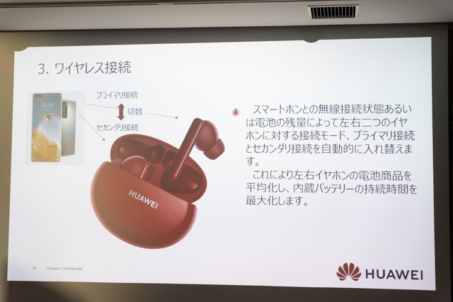 そのほかFreeBuds 4iのポイントとして、接続についても言及。キャリングケースの蓋を開けると接続開始できるほか、電波の状況を見分けて左右のマスターを入れ替えることで、接続安定性とバッテリーの最大化を図っている。さらにゲームを検知して遅延を軽減する低遅延モードや、装着検知機能も特徴とアピールした。