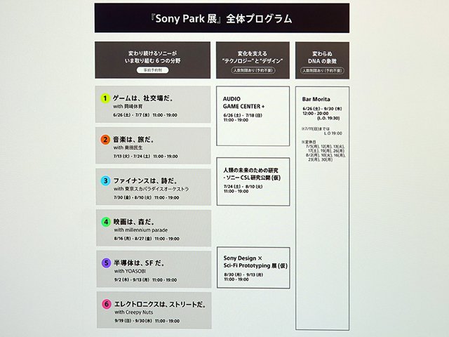 今回の「Sony Park展」の会期は9月30日まで。会期後はソニーパークをいったん閉じて新ソニービルの建設に移ることになっているが、「ソニーパークには(元々の)ソニービルの思いが継承されており、その流れで新しいソニービルをつくる」と永野氏は説明。「ふつうの商業ビルをつくるつもりはない。ユニークであり続けることを肝に銘じて秋以降も活動を続けていきたい」と挨拶した。