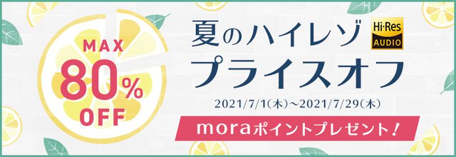 「夏のハイレゾプライスオフキャンペーン2021」では、60%以上の大幅オフタイトルについて「大幅オフ」コーナーでお得なタイトルを一覧できるように展開。また、80%オフタイトルとして『ヒーリング・ヴァイオリン 〜やすらぎの美メロ・クラシック名曲集〜』 や『通勤天国』、『mora Earth』シリーズといったアイテムをラインナップしている。