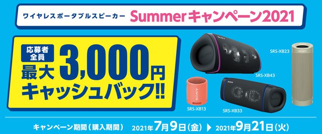 名称は「ワイヤレスポータブルスピーカー Summerキャンペーン2021」で、XBシリーズのワイヤレスポータブルスピーカーを購入することで最大3000円がキャッシュバックされるというもの。対象機種およびキャッシュバック金額は「SRS-XB43」が3,000円、「SRS-XB33」が2,500円、「SRS-XB23」が2,000円、「SRS-XB12」は1,000円となっている。