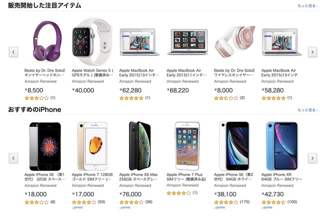 Amazonは、整備済み品として、AirPods ProやiPhone、iPad、Mac、Apple Watchなど、人気アップル製品をはじめとした商品を特価販売している。