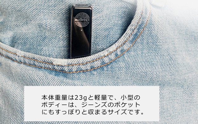 本体は一体成型のメタルボディに傷のつきにくいアクリルを採用し、外観寸法はW15×H53×D10mm、質量は約23gとコンパクトかつスマートな外観を実現している。