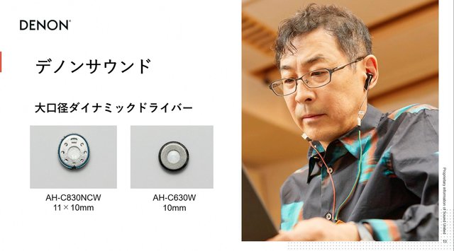 D&Mからはデノンの営業を担当する田中氏と、エンジニアの冨田氏が登壇。先日発表されたデノンブランド初の完全ワイヤレスイヤホン「AH-C830NCW/C630W」を紹介した。発売日は10月15日を予定しており、想定実売価格はAH-C830NCWが税込19,800円前後、AH-C630Wが税込9,900円前後。