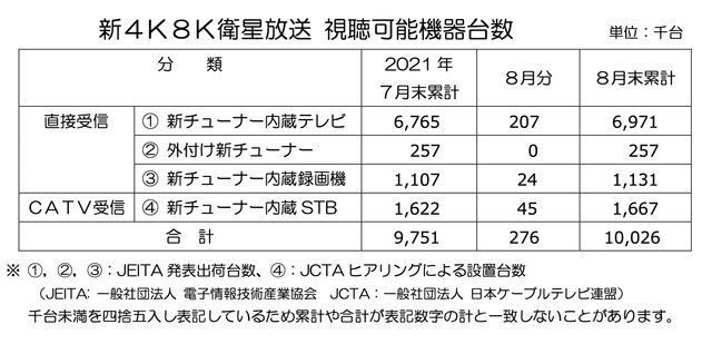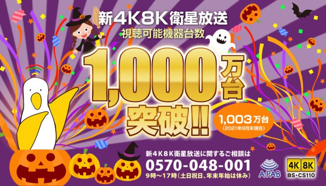 放送サービス高度化推進協会(A-PAB)は、本日9月22日に報道関係者向けのオンライン発表会を実施。新4K8K衛星放送視聴可能機器台数が、2021年8月までの時点で累計1,000万台を突破したことを発表した。