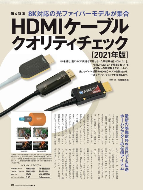 第4特集は「HMDIケーブルクオリティチェック[2021年版]」。最新のHDMIケーブルは、バージョンが「2.1」まで進化。HDMI 2.1で規定された48Gbpsの帯域幅をサポートし、4K/120Hzや8K/60Hzに対応するモデルが国内外のメーカーから登場しています。本特集では、光ファイバー採用のHDMIケーブルを6モデル厳選。一斉クオリティチェックを行いました。