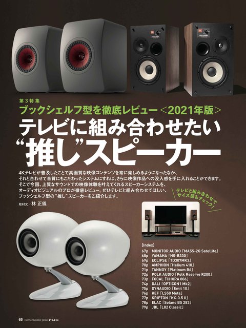 第3特集は「テレビに組み合わせたい“推し”スピーカー」です。リビングのテレビの横に置くだけで、音楽や映像を上質な音で楽しめるブックシェルフ型スピーカーを13モデル厳選し、林 正儀氏によるサウンドレビューをお届けします。MONITOR AUDIO「MASS-2G Satellite」やECLIPSE「TD307MK3」などコンパクトかつ比較的導入しやすい価格帯から、ペア20万円以上のハイエンドクラスまで、ブックシェルフ型はいま選り取り見取り。本特集を参考に、リビングのテレビのサウンドをグレードアップしてみては? 下記のアイテムを取り上げていますので、気になっている方はぜひお手に取っていただければうれしいです。