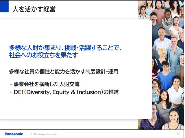 人を活かす経営として、グローバル24万人の社員ひとりひとりの挑戦を支援、事業横断の人材交流を積極的に行う。不安や悩みなどハードルをとりのぞき、パナソニックで働くよろこびやほこりを感じられるよう、多様性を生かす取り組みを行う。DEI(Diversity, Equity & Inclusion)への取り組みも積極的に行うとした。