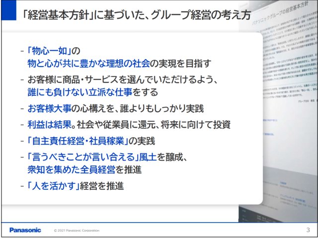 「パナソニックはものづくりや技術、商品、サービスなどあらゆる領域に大きなポテンシャルをもち、すばらしい人材に恵まれている」と実感しつつ、「どの事業にもまだまだ改善の余地がある」とし、創業者松下幸之助氏時代の経営基本方針「綱領・信条・七精神」に立ち返り、これを現代に則して改訂、新たな経営基本方針とした。
