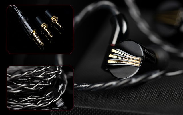 ケーブルは合計224本の高純度単結晶純銀素材をTPU被覆で絶縁し、4本に編み込んだMMCXリケーブルを付属。プラグ部は2.5mm/3.5mm/4.4mmの3タイプに交換可能で、さまざまなソース機器で理想的な再生を実現できるとする。