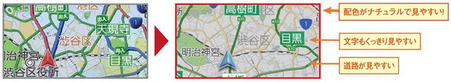 地図についてはHD解像度対応の「HD美次元マップ」を搭載。視認性を考慮した配色の新デザインを採用し、文字や道路、自社位置マークが見やすくなった。また、3D地図描写では、ビルの明かりや影までリアルに表現できるほか、自車位置マークの周りだけを透過することで視認性も向上させている。