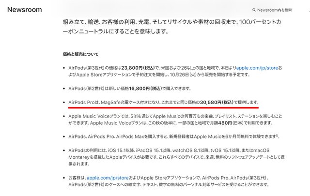 本日発表した「AirPods(第3世代)」のプレスリリース中で明らかにしたもの。リリース下部にある「価格と販売について」の説明において、「AirPods Proは、MagSafe充電ケース付きになり、これまでと同じ価格の30,580円(税込)で提供します」と記載している。