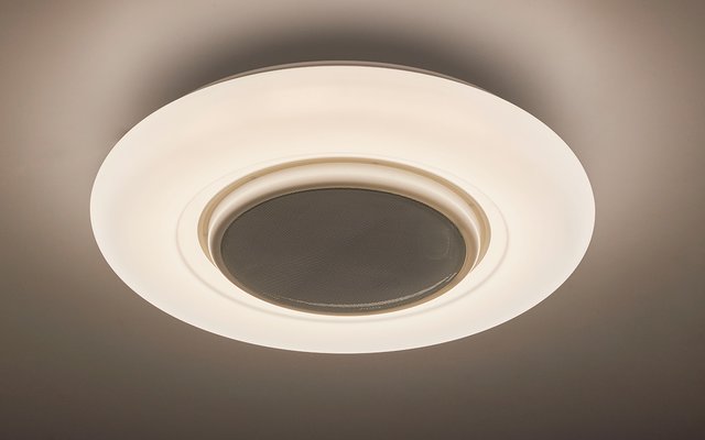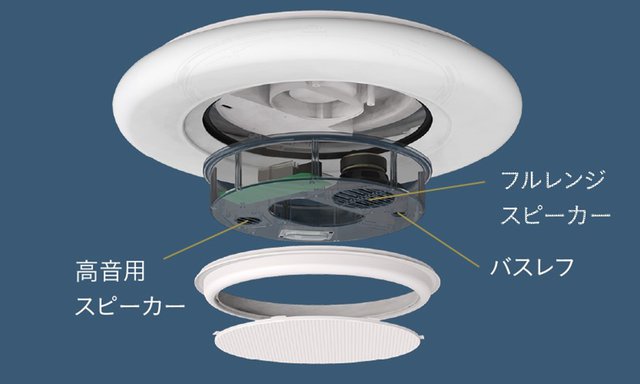 「notes」は、最大出力10WのBluetoothスピーカーを搭載したLEDシーリングライト。スピーカーは、高音域を出力するφ31mmトゥイーターと、全音域に対応するφ70mmフルレンジスピーカーによる2ウェイ仕様のバスレフ型を搭載。これにより、バランス良く広い音域をカバーしながら、全体的に豊かで伸びのある音質を実現したという。BluetoothはaptXコーデックにも対応している。