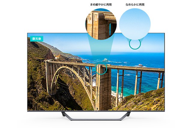 地上波や衛星放送などを4K品質にアップコンバートする「4K復元」も搭載。さらに、彩度に適した輝度になるように調整し、コントラストを際立たせて引き締めることによって、奥行きや質感の伝わる立体的な映像を実現する「テクスチャー復元」も備えている。