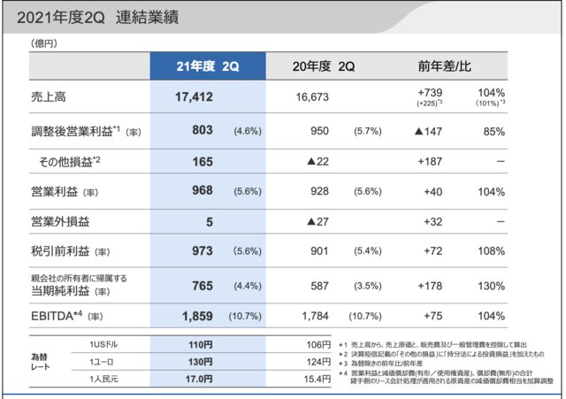 第2四半期の連結業績は、売上高1兆7,412億円で前年比739億円の増収(104%)。調整後営業利益は803億円で前年比147億円の減収(85%)。営業利益は968億円で前年比40億円の増収(104%)。当期純利益は765億円で前年比178億円の増収(130%)となった。