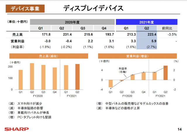 ディスプレイデバイスでは、売上高は前年同期比3.5%減の2,234億円、営業利益は前年同期の赤字から63億円回復して59億円の黒字に。「スマートフォン向け小型パネルが減収、車載向け、PCタブレット向けなど中型パネルの販売が伸長した。販売に占める中型パネルの比率が上昇するなどモデルミックスが改善した」と述べた。
