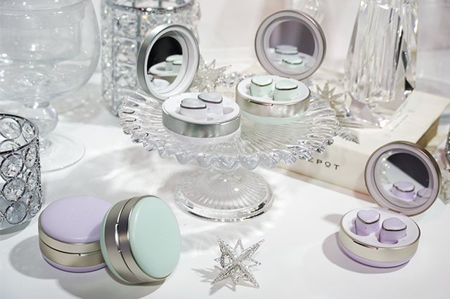 化粧品のような丸いケースには、開くと装着確認などができるミラーが備わっている。本モデルではミラー周囲にLEDライトも配置され、ケース背面にあるボタンを押すと点灯。いわゆる “女優ミラー” と呼ばれる仕様で、ちょっとしたメイク直しにも使える。またファンデーションやリップといった化粧品が付いてしまった場合にも、軽く水拭きするだけで落としやすいような特殊な塗装も施されている。