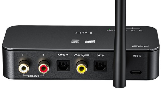 背面にはBluetooth接続用外付け高ゲインアンテナを搭載しており、通常の条件下なら最大30mの範囲で高速・安定した信号伝送が可能。加えて光/同軸の入出力やRCA出力端子、給電も可能なUSB入力端子を搭載する。