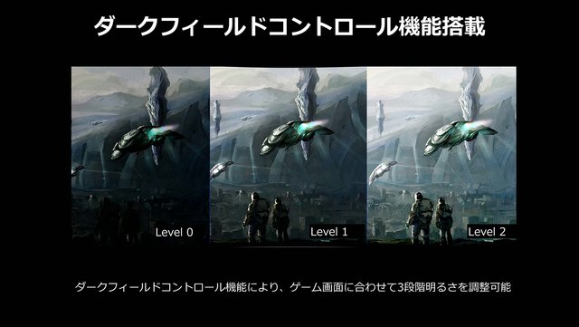 機能面では、ゲーム画面の明るさを3段階で調整可能な「ダークフィールドコントロール機能」を搭載。これにより、ゲーム内の暗いダンジョンといった、暗部での視認性を改善するとしている。