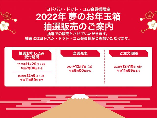 ヨドバシ・ドット・コムは、11月29日7時から「夢のお年玉箱」の抽選申し込み受付を開始する。申込みの締め切りは12月5日23時59分まで。また当選発表は12月7日9時から、注文期限は12月10日23時59分までとなる。